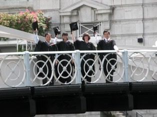 4 mad men and women waving their motar boards like nuts running wild